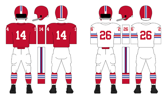 After paying tribute to his father for one more season by wearing the uniforms most associated with the team, Detroit Knights owner Florian Riddle decided that a new era was needed for Detroit football. Their main logo got rid of the interlocking swords in favor of the shield alone. Riddle had wanted the logo to be representative of Detroit as a whole, integrating the design of the city’s flag into the four quarters of the shield with a D in the center. There were a few alterations from flag to logo, mainly reducing the number of Normal lions and fleurs-de-lis to better fit within the shield. However, they did increase the number of stars by 1 to 14 to represent the total number of championships they had won across all the leagues they played in. Their shades of red and blue were altered slightly, though that could be attributed to the new supplier for their uniforms.